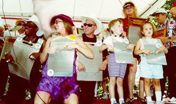18th Annual Washboard Concert Sacramento Jazz Jubilee--2000 Photo by Jeannette Tedmon ![]() L to R--on knees Lloyd Meadows, Kathy Mannix, Frank Bohan Standing Owen Morris (4), Hannah Morris (3) 2nd row Kaye Wade, Allan Grissette |